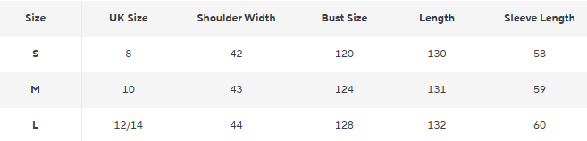 | Special Features | Adjustable belt, epaulettes, cuff straps, full opening |