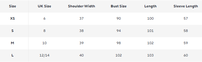 Wide-waist fit, long length, long sleeves, single-breasted button front, flap pockets.