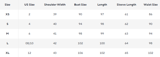 | Special Features | Clean tailored line, structured lapel, discreet pockets |